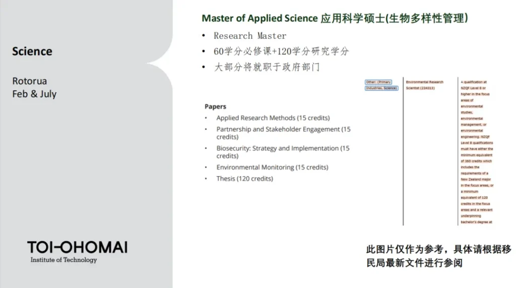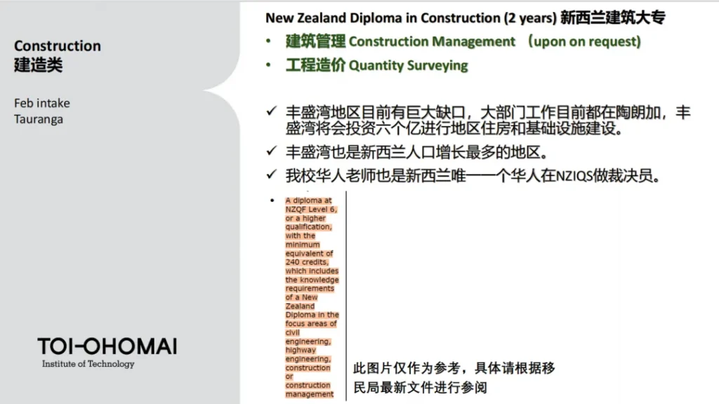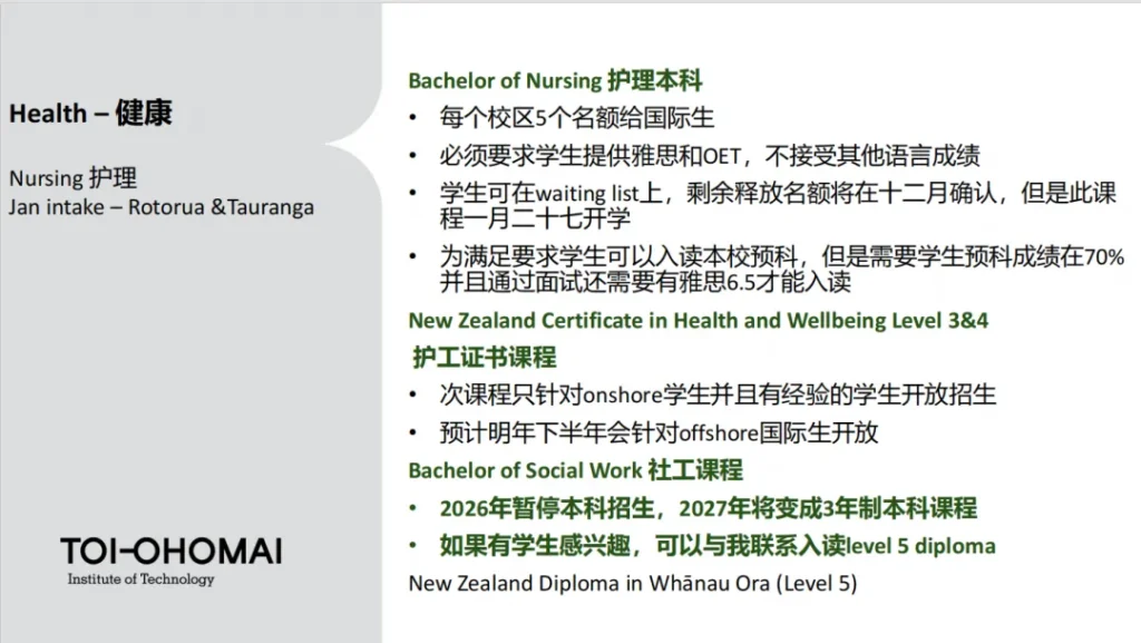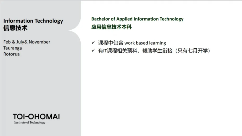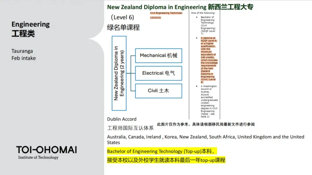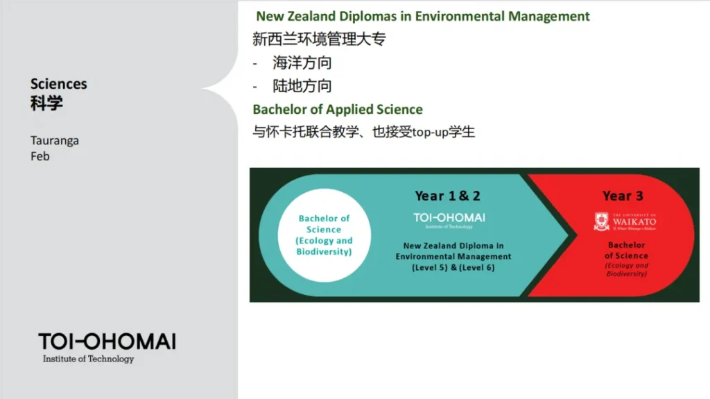 Toi Ohomai 提供从证书 (Certificate)、文凭 (Diploma) 到研究生级别 (Postgraduate) 的课程选择,专业覆盖商务、工程、护理、创意艺术、林业、酒店旅游、交通运输等多个领域。学生可根据兴趣和职业目标,灵活衔接进阶课程。