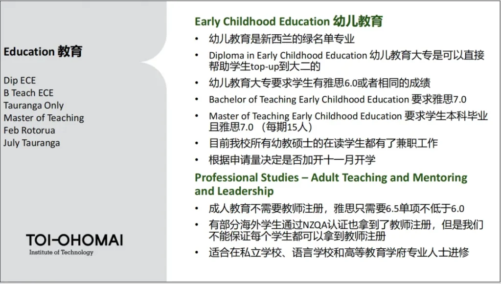 Toi Ohomai 坚持实用导向教育,强调与行业紧密连接。很多课程包含实训与实习环节,帮助学生毕业后能够迅速进入职场。学校与本地企业和社区有合作关系,为学生提供就业、项目实操机会