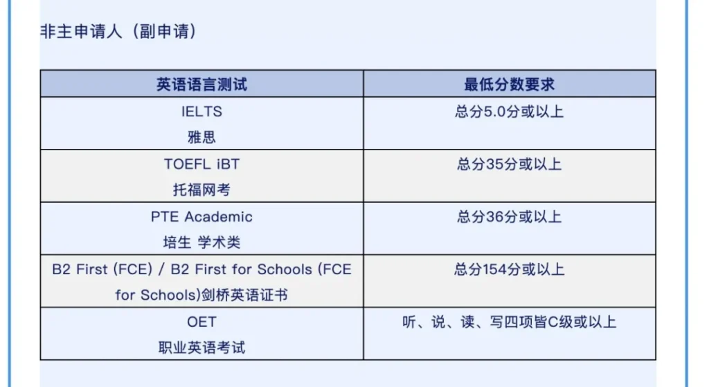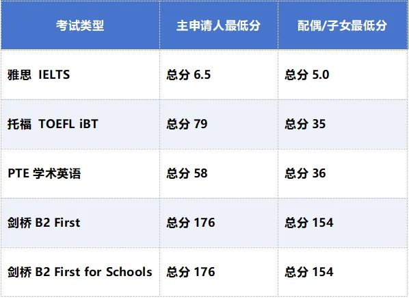 参加英语语言测试,分数要求低于主申请人, 分数要求见表二。