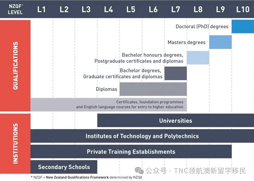 新西兰学历认证局NZQA(New Zealand Qualification Authority)将学历等级(NZQF)共分为10级,从 Level 1 到 Level 10。Level 1 为证书类课程,Level 10 为博士学位。