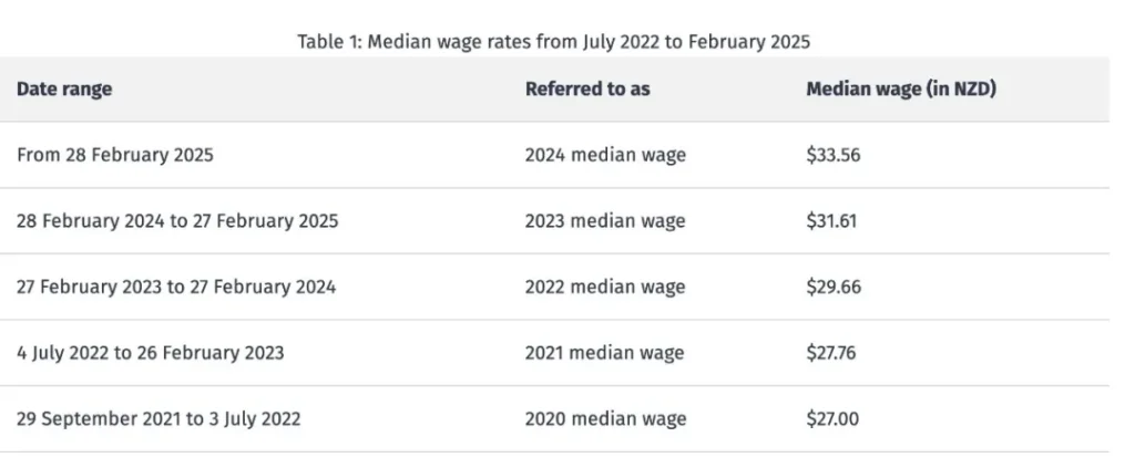 回答:从2025年8月18日起,AEWV相关的工资门槛将根据每小时33.56新西兰元的工资中位数进行调整。